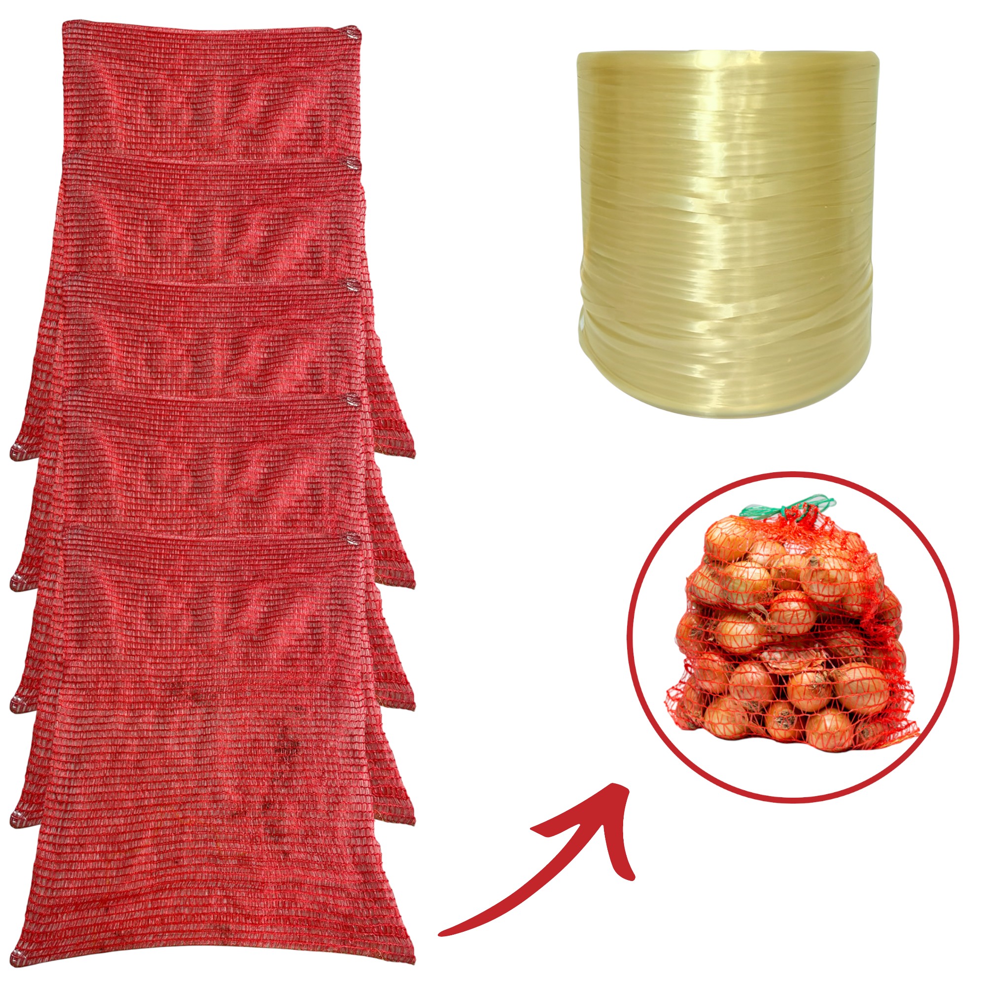 Kit 20 Embalagens Hortifruti Vermelha 20 kg + Fitilho Plástico Ouro 2400 Metros
