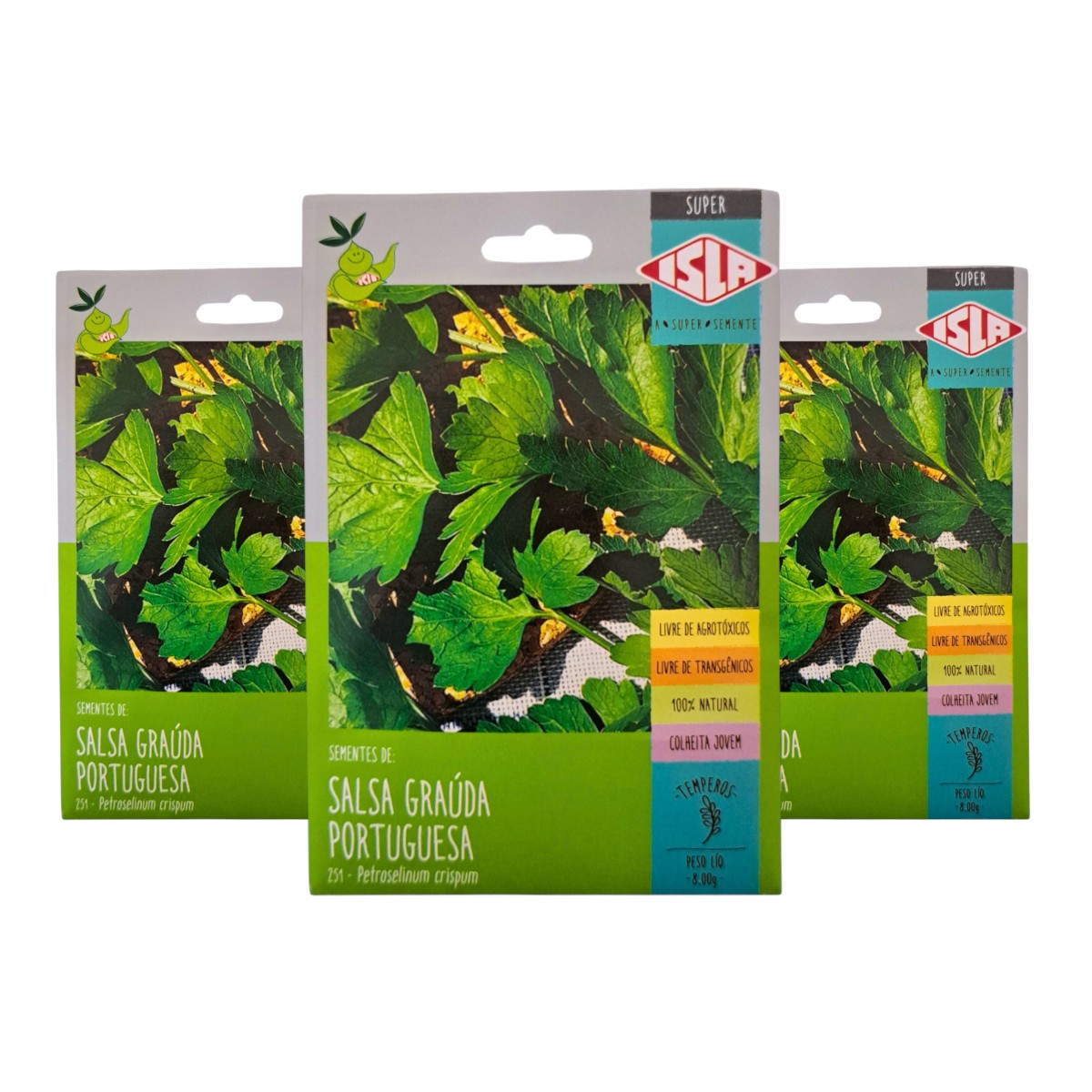 Sementes Salsa Graúda Portuguesa ISLA envelope 8g. Planta rústica com folhas curvadas e verde-escuras, muito usada como tempero na culinária.