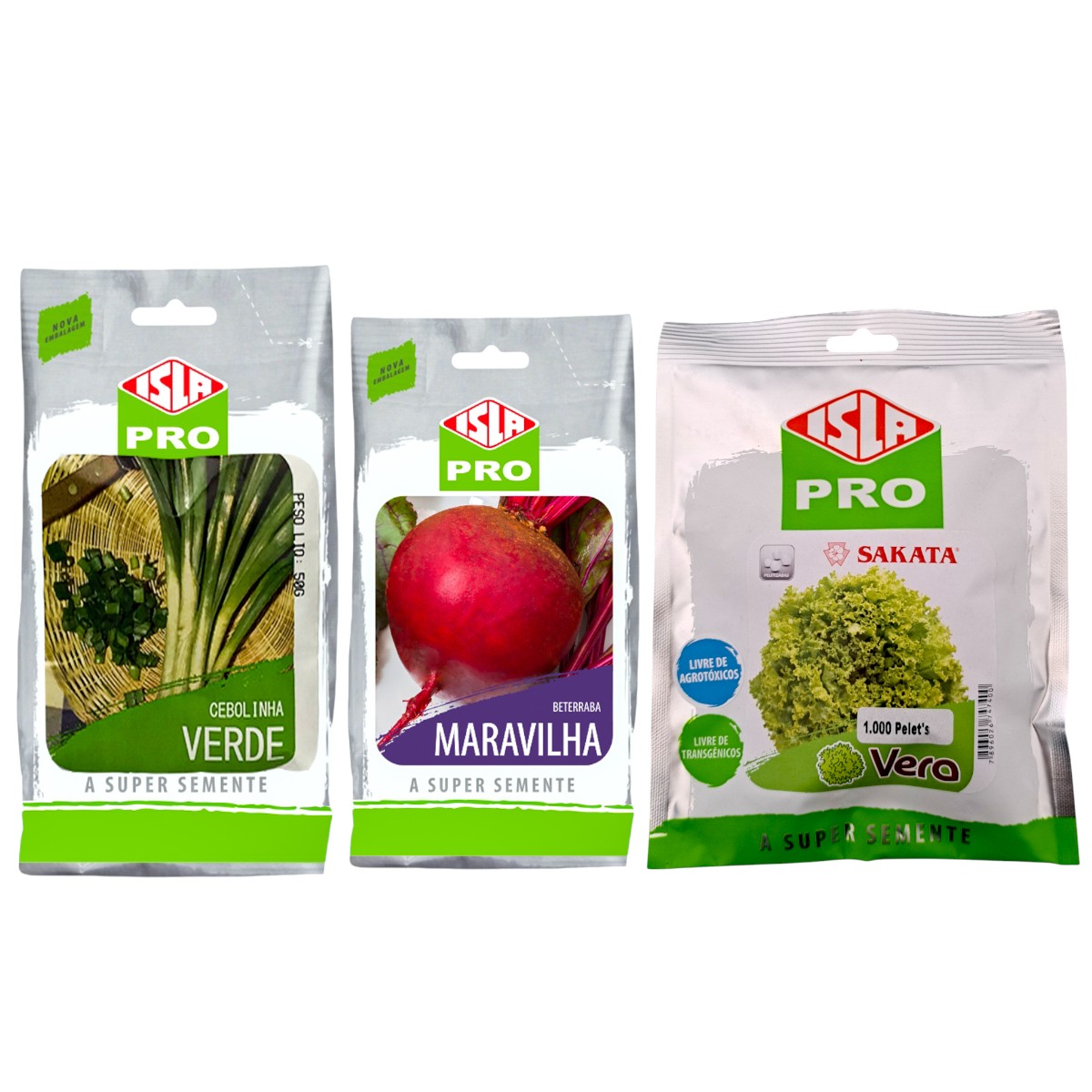 Kit de Sementes de Hortaliças - Alface Crespa Vera Sakata 1.000 Peletizadas + Cebolinha Verde Isla 50g + Beterraba Maravilha 100g